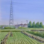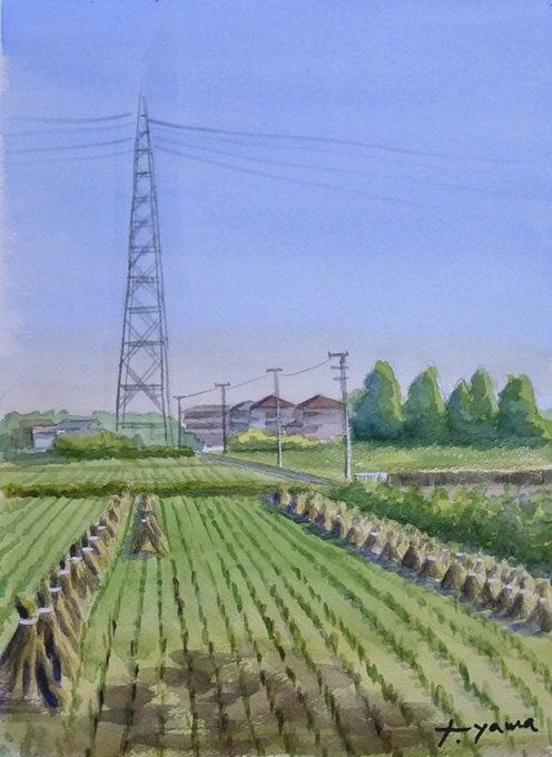 #水彩画 #透明水彩 #風景画 #スケッチ #Watercolor #Watercolorpainting #Landscapepainting #Sketch 境川自転車道わきの水田地帯では田植えが始まっています。境川は神奈川県を南北に縦断する川で、この自転車道を南に(右方向に)2時間走ると江の島に行きます。