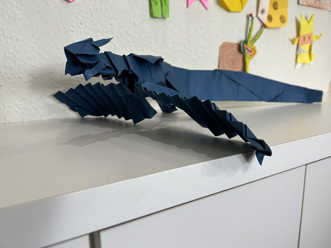 121 854 息子(8才)が作ったドラゴンの折り紙。大きい画用紙1枚で1箇所も切らずに作ったらしい。え?おい、天才か?(°▽°) 23/07/20 13:47