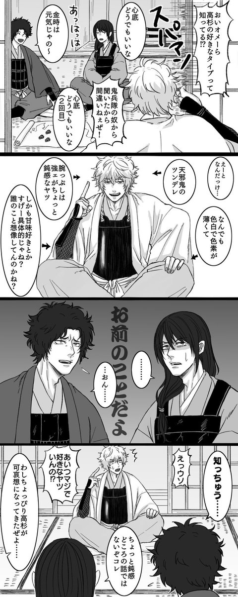 高銀推しの土方と土銀推しの高杉とずや推しの坂田 ここまで描いといてあれなんですけど多分普通に杉は高銀過激派だし、土は土銀過激派だと思います