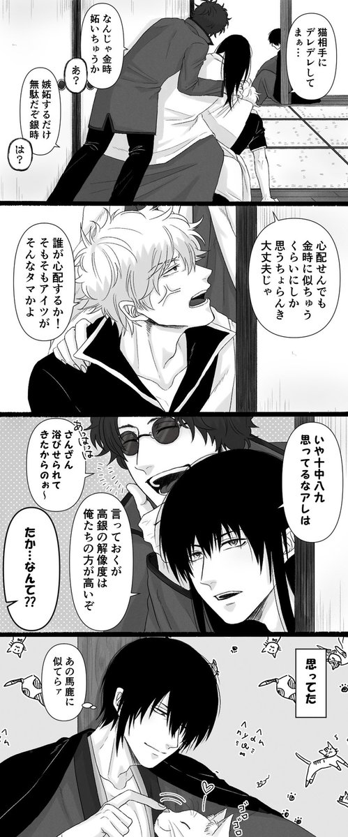 56 379 3日後に元に戻った高銀 2022年は🐈年なのでいつでも🐈耳を描いて良い年なのだ…… 最後のコマは昨日の夜のコトを思い出してるはっぴ〜な高杉です 22/07/16 21:50