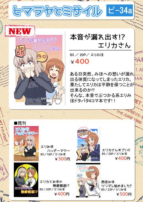 📢C99告知! 12月30日(木)の「コミックマーケット99 1日目」にサークル出展します!新刊あります!!✨ エリみほがお酒を飲んだら?という妄想を形にした4コマ漫画本になってます!🍺 『エリみほハッピーアワー』 ◆スペース:東Q37a ◆会場価格:300円/16p #C99 🍈melonbooks.co.jp/detail/detail.…