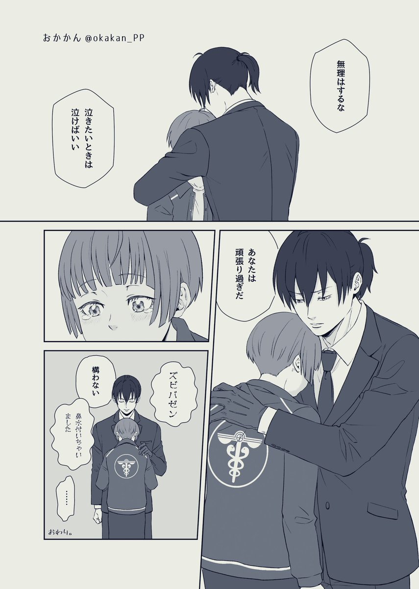 リクエスト「宜野座の胸の中でホッとして泣く朱ちゃんが見てみたいです🥰」 BOOSTありがとうございました✨もう既に描かれてきたであろう感じになってしまいました😅(自分も描いたような気がしてる)
