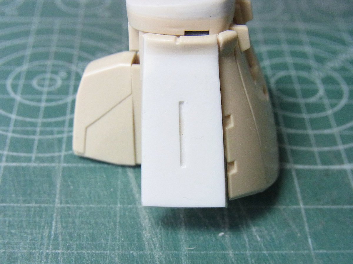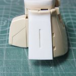 32 142 デザクの胸。 彫るのは苦手なのでプラ板で積層して後から埋める作戦。 かなり本体胸側を削る(切る)事に。 胸の角度は大丈夫か不安だけどヘソの三本の長さを見るに許容範囲・・・かな #06D 19/02/24 18:29