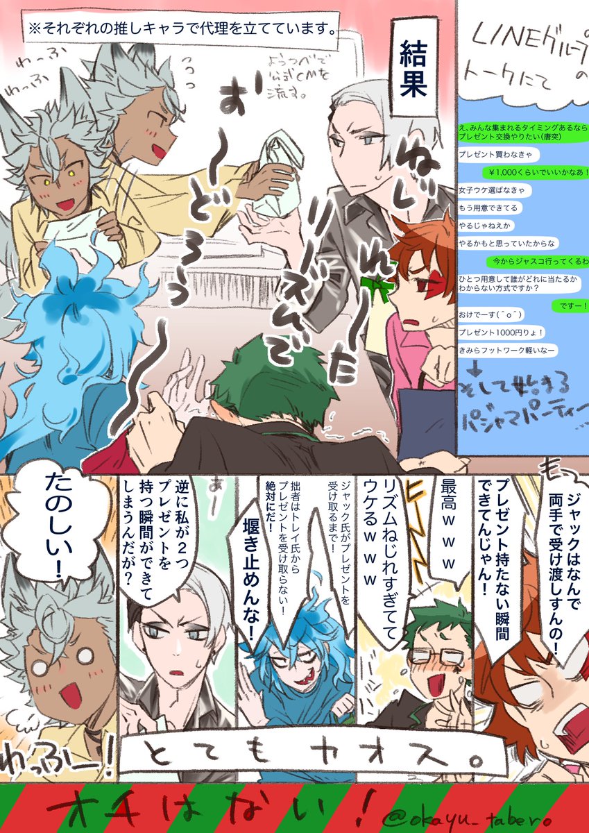 こちらアラサー女子たちのクリスマス女子会でございました。 始終爆笑してた。 (みんな魔法は使えないのでちゃんと手洗いうがいを徹底してからの参加となっております) #twst #twstファンアート #twstクリスマス #実録漫画 #絵描きさんと繫がりたい