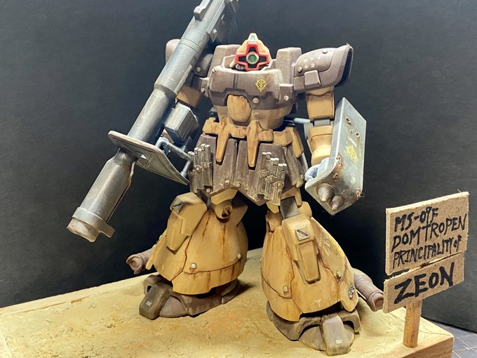 ドムトローペン サンドブラウン完成しやした。 いわゆる成形色活かし部分塗装というやつでありんす。 それにつけてもやっぱりウェザリングは難しいでやんす。 とはいえ出来はともかく気に入ってやす。 ジークジオン! #ガンプラ #ガンプラの画像貼るとRTされると聞いて #ドムトローペン