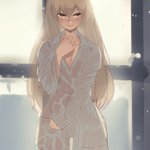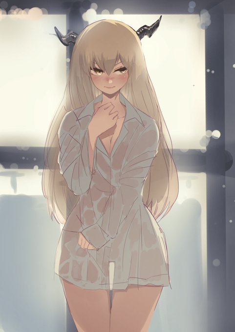 @Fiin36772 さん家のライラさんを描かせて頂きました。 彼シャツシチュ!!!何故かシャツが濡れています。なんでだろう
