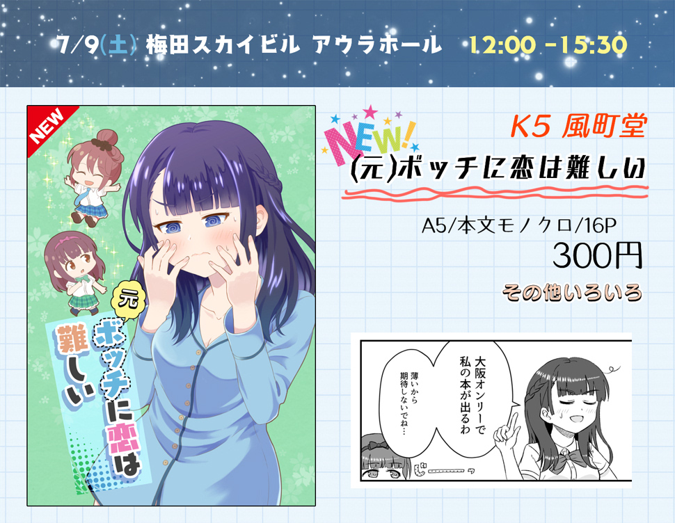 告知が遅くなりましたが、7/9(土)に梅田スカイビルで開催される運命のガールズ(記念)に参加します。 風町堂としてのイベント参加は数年ぶりとなりますが、新刊や既刊を用意してお待ちしています! 新刊以外の詳細はBOOTHでご確認ください →furuhiro.booth.pm