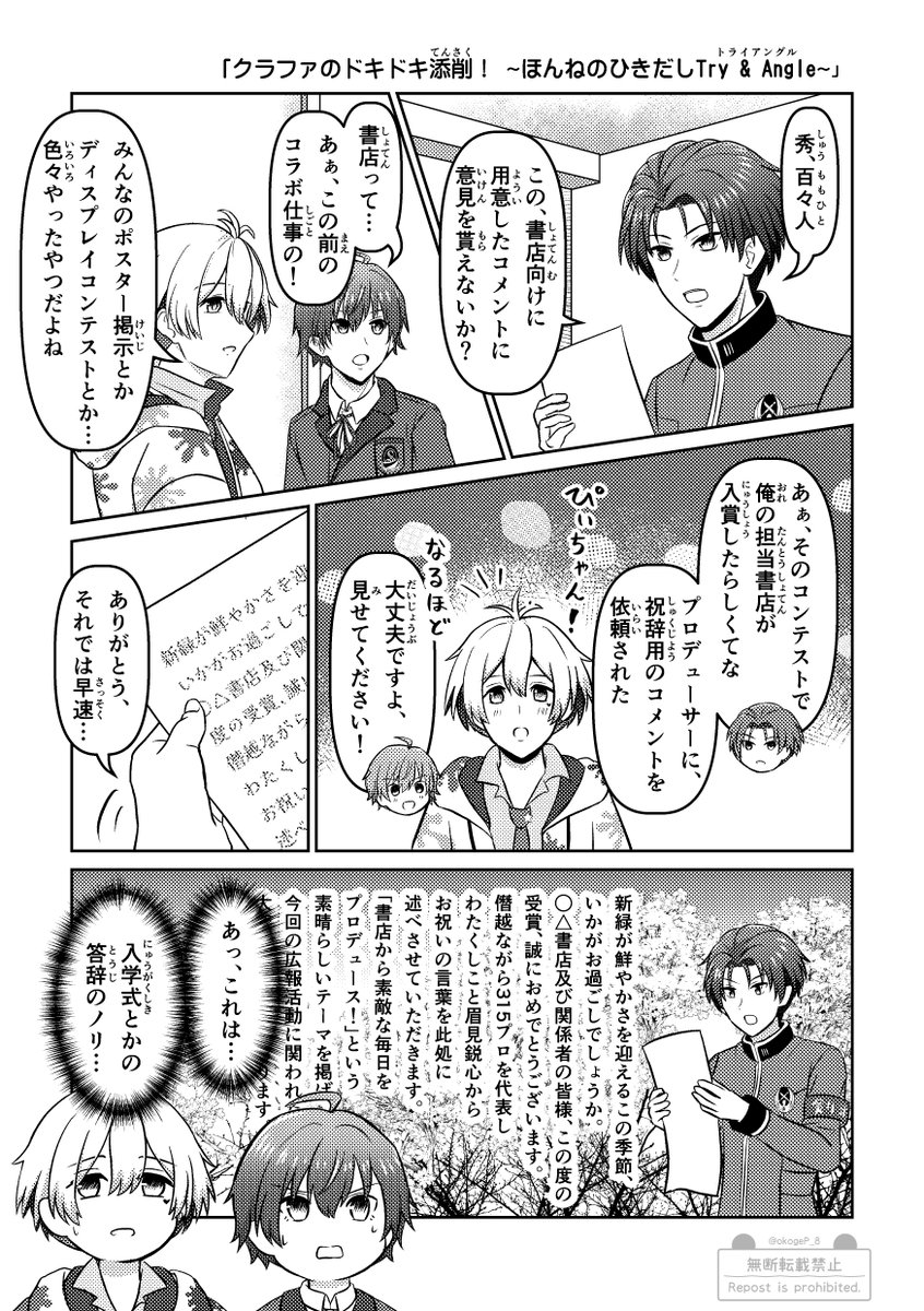 【ゆる告知】 新刊のクラファ漫画詰め合わせ本、4/30日までの期間で 本文まるごと公開中です! 画像から察して貰えると思いますが、なかなかボリューミーです。 漫画の量もオマケページもモリモリです。(※本文68P) 良ければ覗いてみてください〜。 lit.link/okoge808
