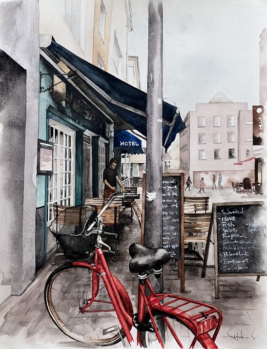 水彩教室の時間は、 ちょっと先生らしく😅 正統派な水彩画を描く事にしています。 自転車が好き。 #watercolorpainting #自転車のある風景 #じてんしゃのある風景 #赤い自転車 #watercolors #watercolorist #水彩画 @okotas64