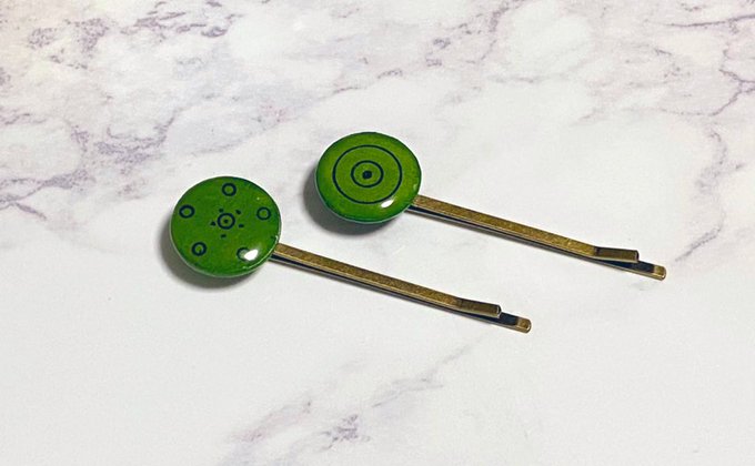 じらいちゃんヘアピン完成品🟢🟢 まつさんのじらいちゃんヘアピンのアイデアが素敵すぎて、許可いただいて作りました。 ピン部分黒くしたかったし、まだまだ改善の余地有り! #bintrollFA ? twitter.com/matuyuban/st…