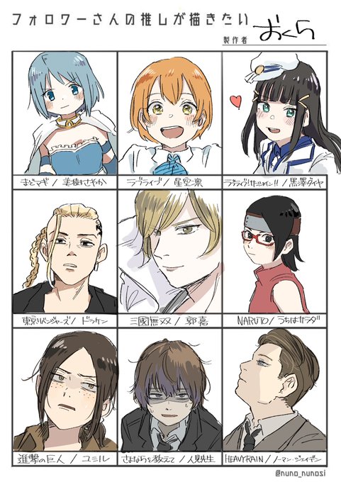 描けたぁ!!!!! 初めて描くキャラもいっぱいいて楽しかった〜!!!! 塗りが死ぬほど雑で申し訳ない… リクエストくださった方ありがとうございました☺️✨ みんなの推し、ビジュアル最高だな… #フォロワーさんの推しが描きたい