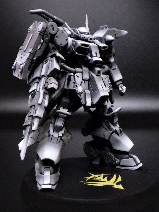 #ガンダムアーティファクト ザク3完成?しました。 下地のつもりで黒~白でグラデかけるB&Wで塗ってたんですが、このサイズですし、こんな仕上げも面白いかと思いましていったん完成と言うことにしました。 しばらく飾って気が向いたら色を乗せようかなとか思っています。(続