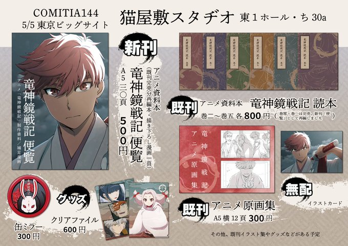 🎏5月5日 #コミティア144 お品書きです! 新刊はアニメ資料本完売分を再編して、表紙と漫画1頁を描き下ろしました。他に原画集やグッズも持っていきます。新刊表紙のイラストカードは無配です。 【ち30a 猫屋敷スタヂオ】でお待ちしております! #COMITIA144 twitter.com/omi_neko/statu…