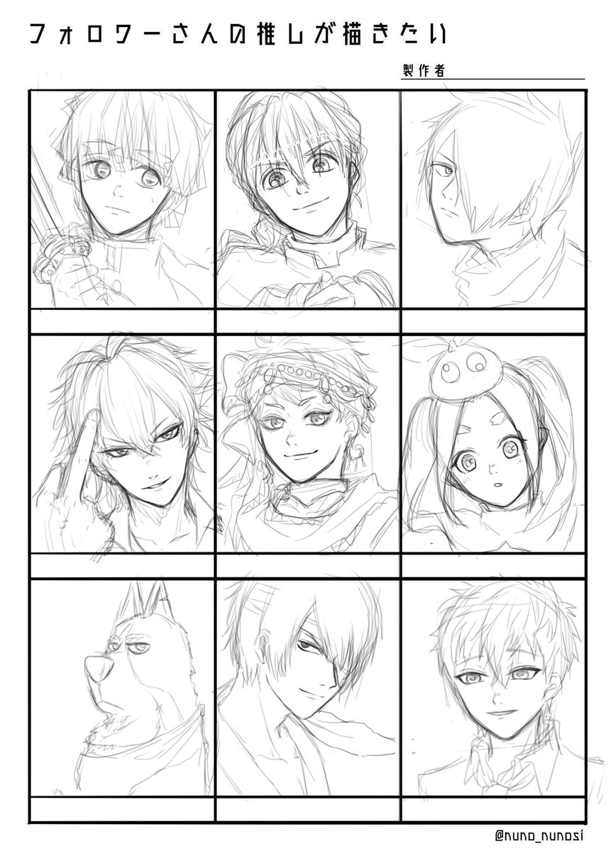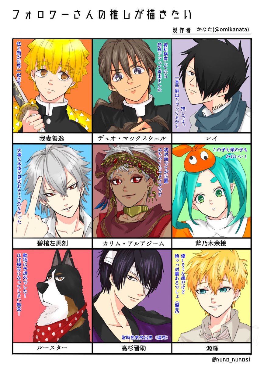 でけた☺️ 推しを教えてくださった皆さんありがとうございました!みんな顔がよくて描くの楽しかったです😍 塗ったら印象変わっちゃったのでラフ時点のも。 #フォロワーさんの推しが描きたい またやりたいです😊 twitter.com/omikanata/stat…