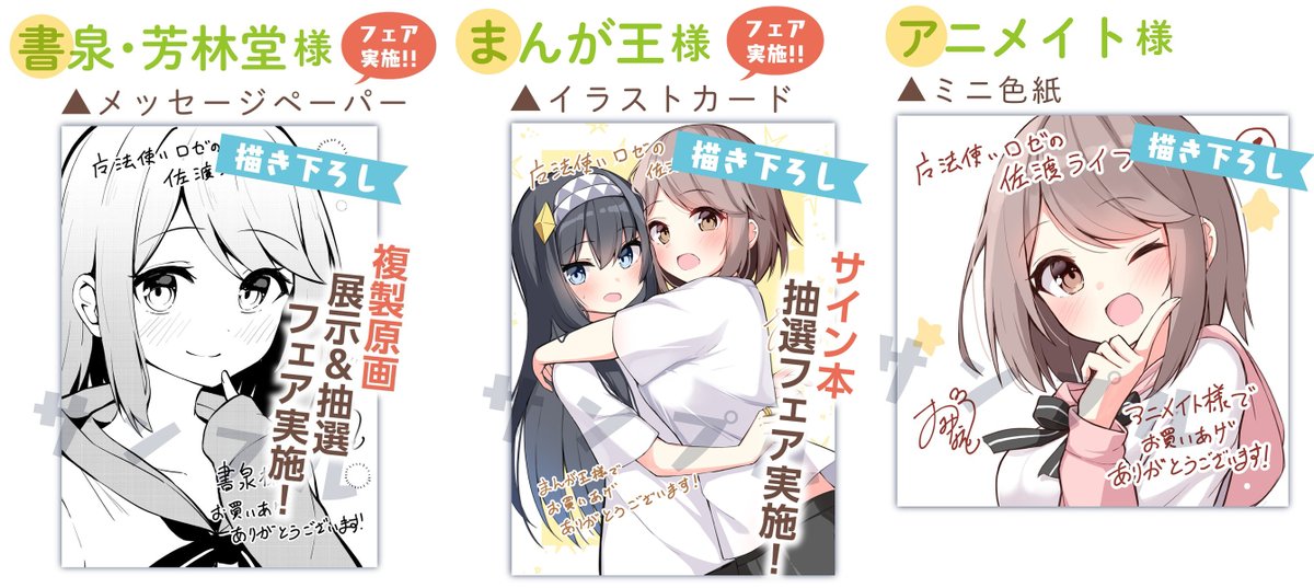 【特典情報2】 フェアを実施してくださっている店舗さまとミニ色紙が特典のアニメイト様! 書泉様(サイン入り複製原画) shosen.tokyo/?pid=174497323 まんが王様(サイン本フェアは5月10日まで) mangaoh.co.jp/topic/topic_gr… アニメイト様 animate-onlineshop.jp/sphone/pn/%E3%…