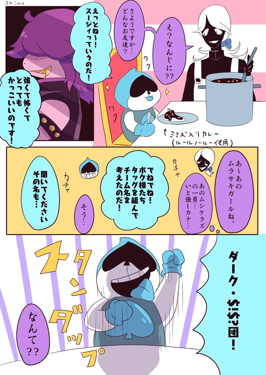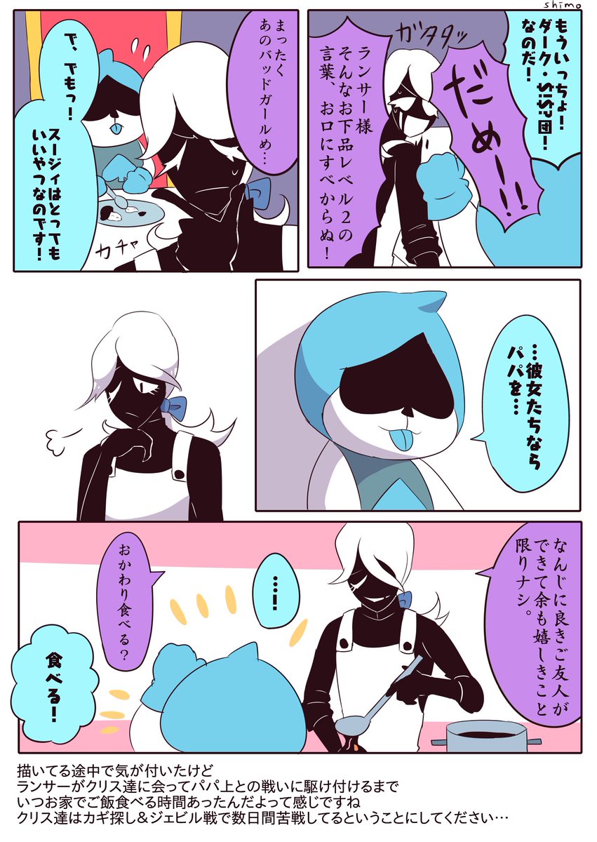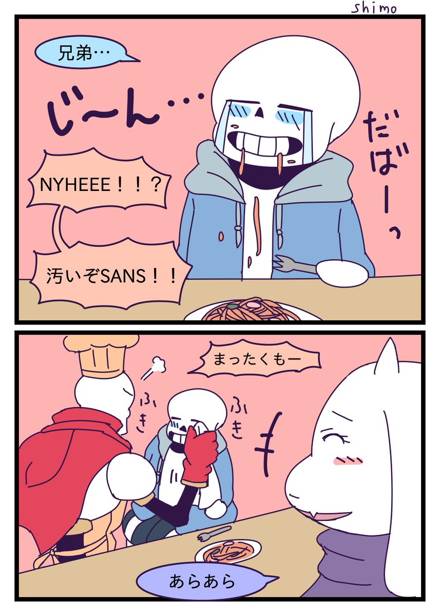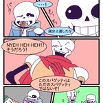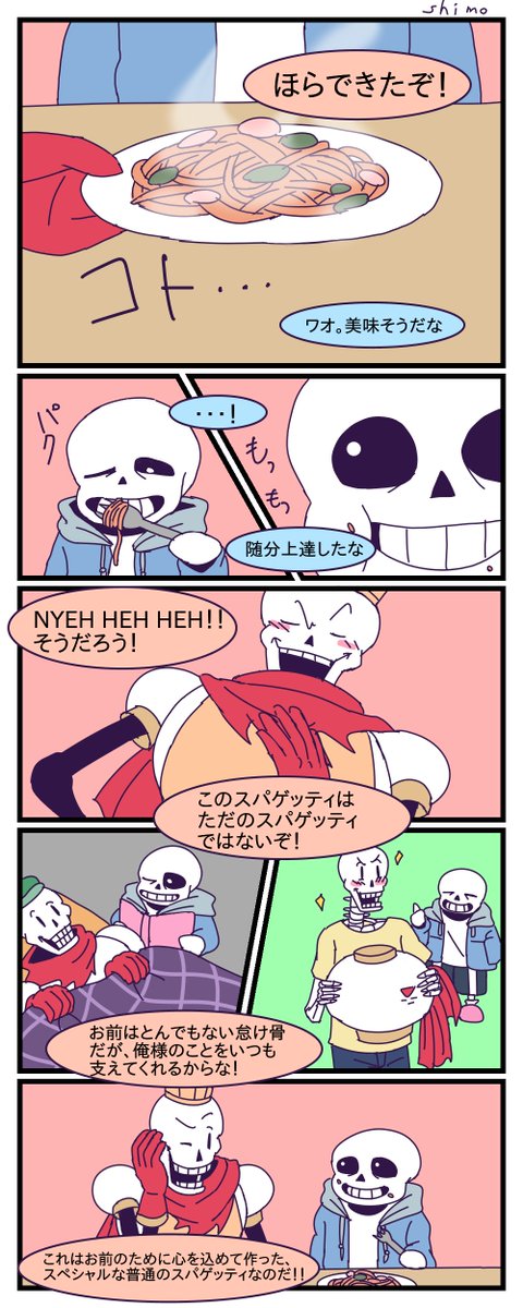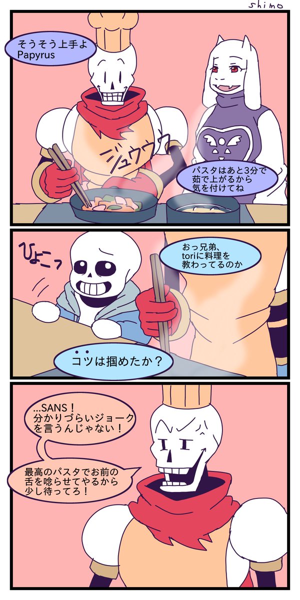 リクエストBOXの「TPルート後、マッマに料理を教えてもらっているパピルスと茶々を入れるサンズ、完成したスパゲッティを食べるサンズに声をかけるパピルス」です!ありがとうございました!