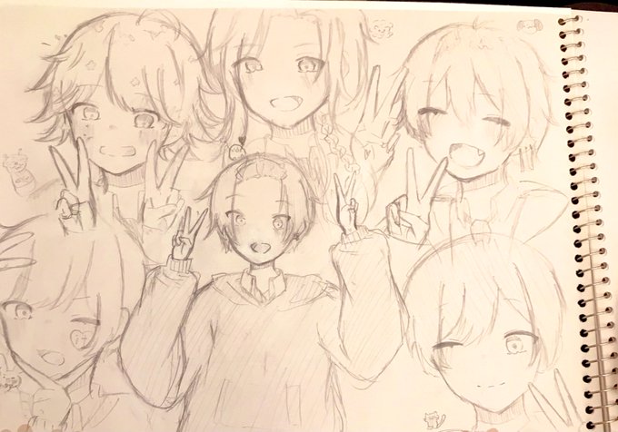 子供組はダブルピース!!大人組はピース!!描きかけです!!りうらくんはてぃくとくようなので小さいですが 伸びたら描きなおします…!! #いれいすあーと #いれいす #きいてよりうらくん #聞いてよないこくん #みにうさー #あにきっず #仏イム #いふ民の乾杯挨拶