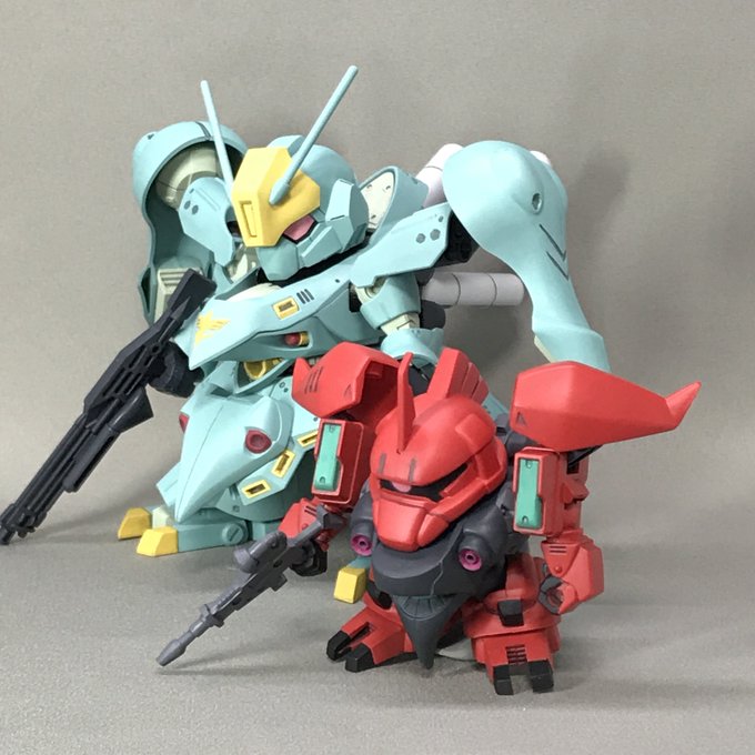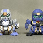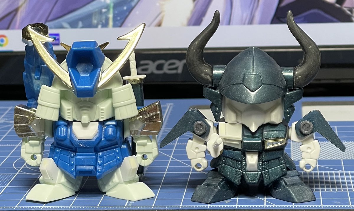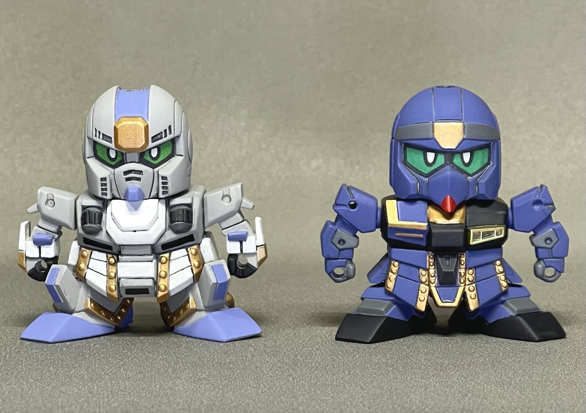 武者プロトMK-Ⅱと武者FAZZ完成です。2体で20円の中古品をさっくり作りました。欠品部分はプラ板等でアレンジして足の接続位置をいじっています。 #SDガンダム #ガンプラ