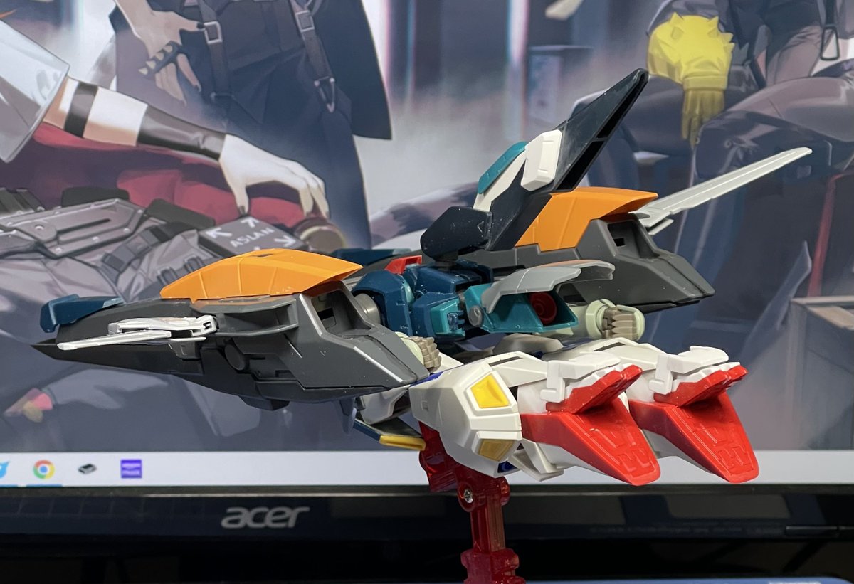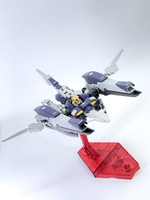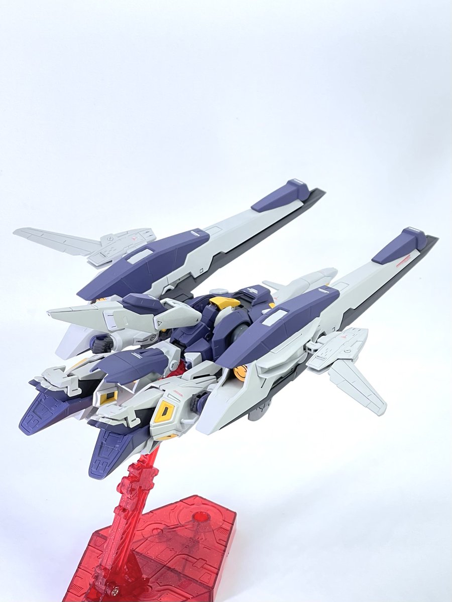 15 44 他アングルから。リスペクト元機体と同じく本来は逆関節。地上での歩行性能は劣悪で飛行形態が本来の姿となります。某テストチームのカラーとは似て非なるものです。兎に角可変機の改造は大変でした。 #ガンプラ 23/02/07 21:34