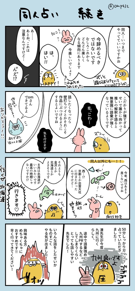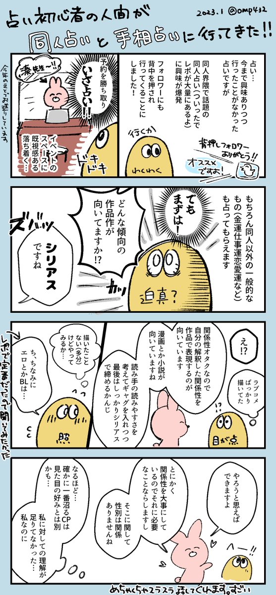 同人占いで話題の湊きよひろ先生(@nil_plus)のところに私も行ってきました~!人生初の占いがと~っても楽しかったので覚え書きのレポ🥰同人活動してなくても推しがいるなら絶対楽しいのでは…と思いました!自信を持っておすすめできます👍👍👍 実は…続きます…