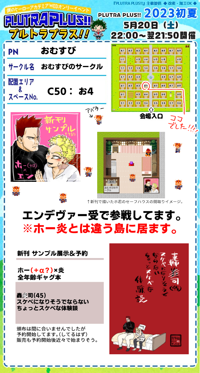 ごめーん!!!地図間違えてた!!! お品書き直しました!!!!! プルプラでホー(+α?)炎ギャグ本、予約開始します! 6月のオンリーにも持ってくからいっぱい刷った。 当日Twitterで長めのサンプルも公開するので、それみて判断してください。 #プルプラ23初夏