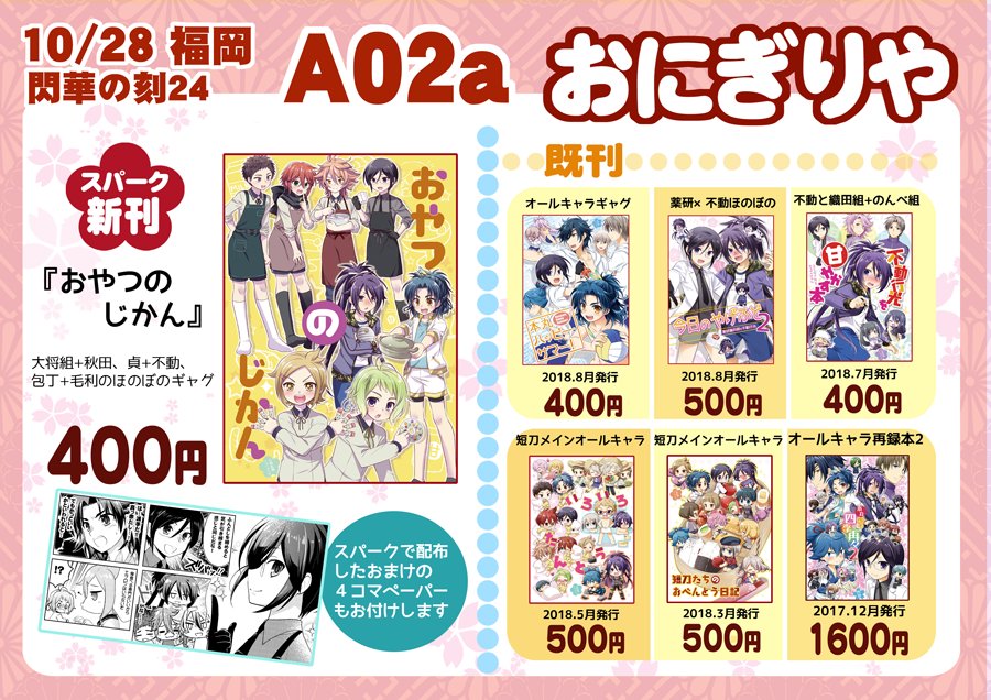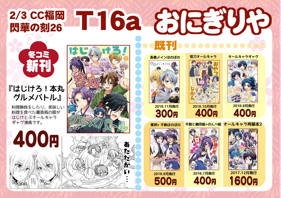 【2/3福岡閃華】おしながき | オムスビ【2/3福岡T16a】 #pixiv pixiv.net/member_illust.… :福岡閃華のおしながきをアップしました。頒布物の内容は冬コミ・インテと同じです~よろしくお願いします!
