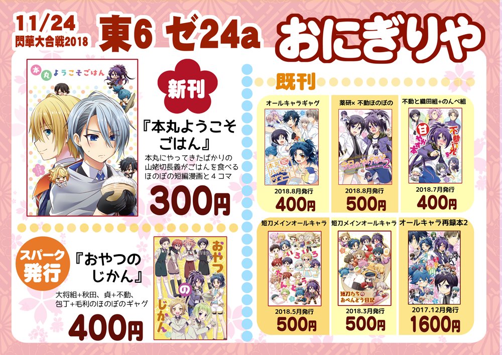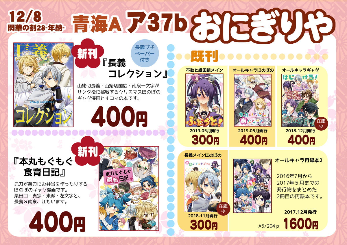 【12/8閃華】おしながき | オムスビ@12/8閃華ア37b #pixiv pixiv.net/artworks/78166… :閃華年納おしながきをアップしました。新刊はオールキャラ本と長義本の2冊です~!