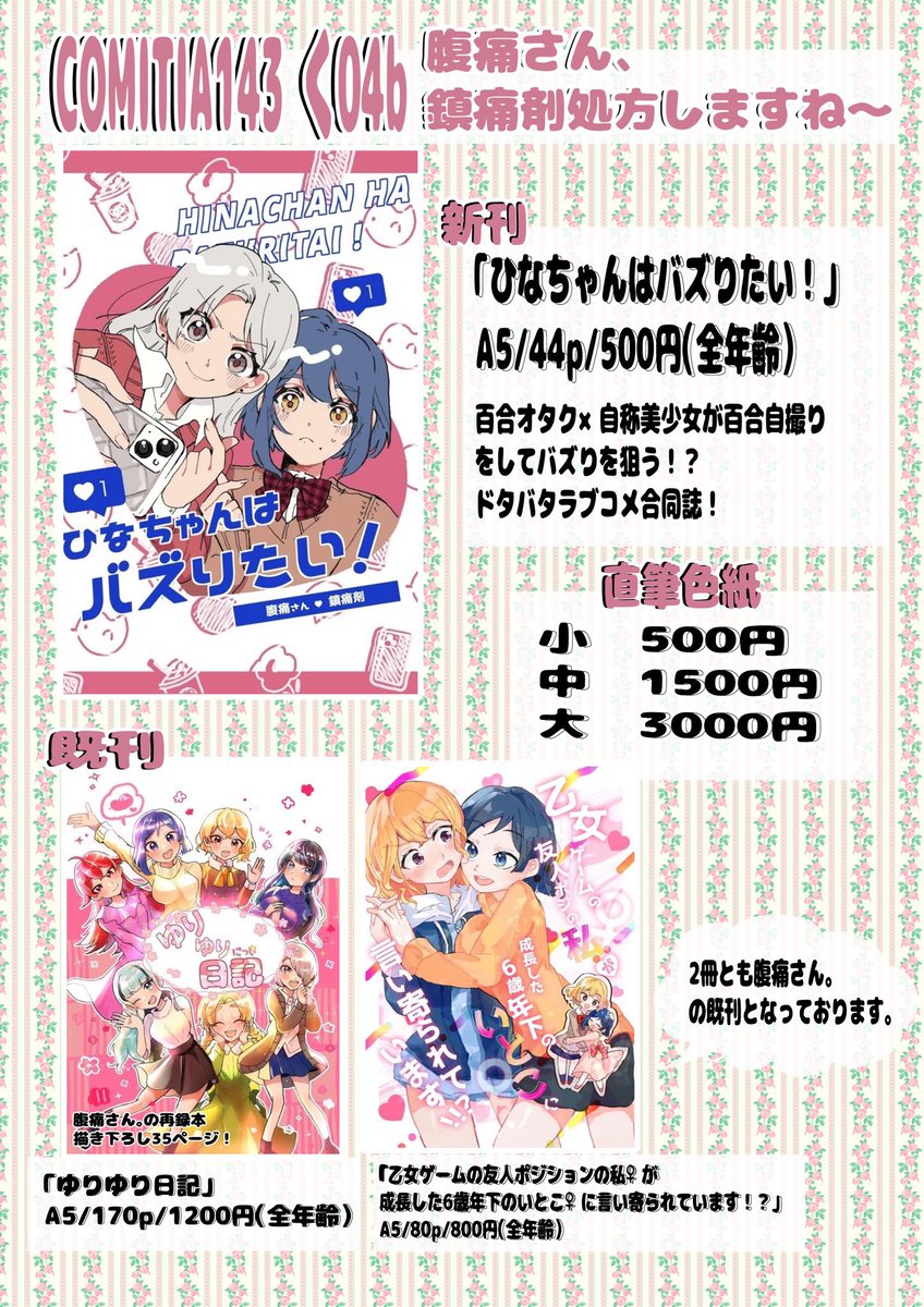 🌟2月19日のCOMITIA143お品書き🌟 スペース:く04b スペース名:腹痛さん、鎮痛剤処方しますね〜 鎮痛剤(@173_162 )さんとの合同サークルになっております🌸 新刊の合同誌の他、既刊2冊と色紙持って行きます。よろしくお願いします❣️ #コミティア143 #COMITIA143