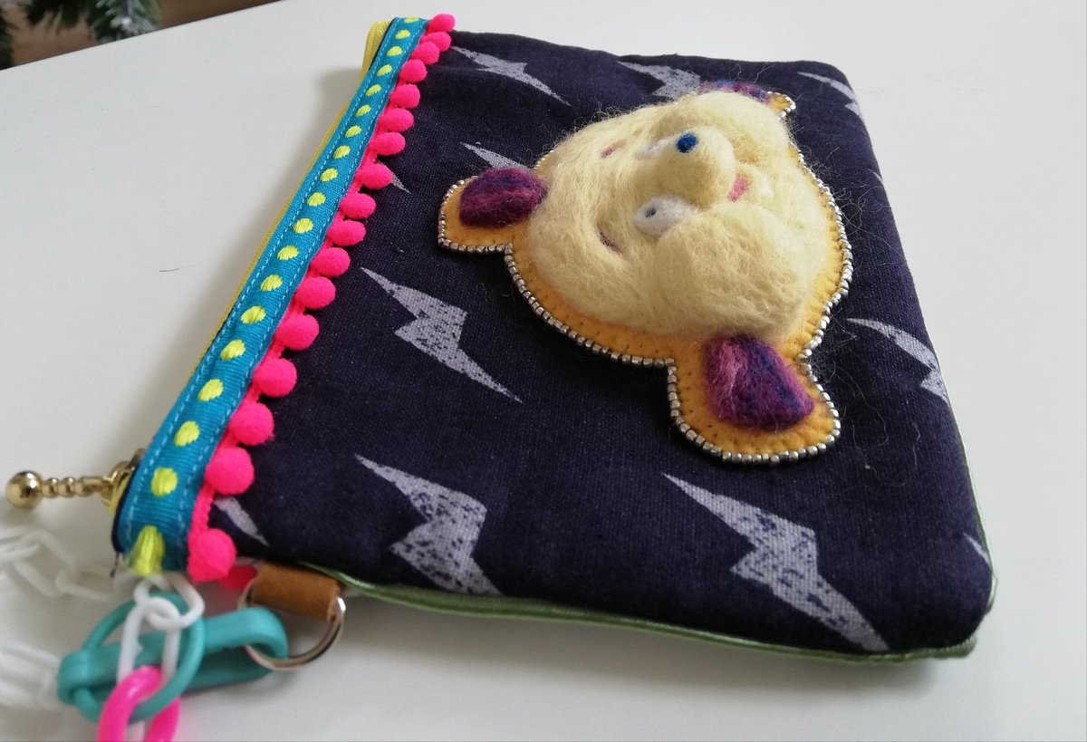 サーモンランポーチ 黄色いポンポンは金イクラをイメージ✨ ショルダーバッグにも出来るように金具つけました サモラン柄が気になる時は、裏にすればファーなので普通のポーチになります笑 #スプラトゥーン手芸部 #Splatoon2