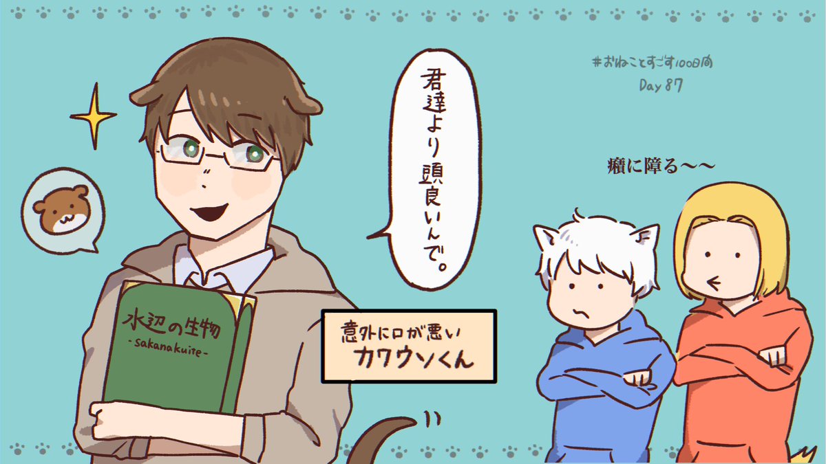 こないだのカワウソ君も擬人化させました!癪に障る~~~📖 #擬人化 #おねこと過ごす100日間 #絵描きさんと繋がりたい