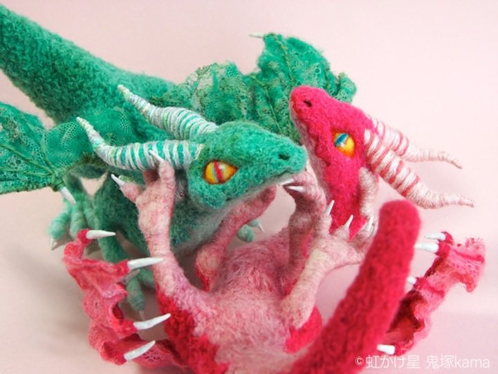 明日7/2は【オンライン】虹かけ星の小さな幻獣羊毛フェルト4回目! #虹かけ星の羊毛講座 赤いワイバーン型ドラゴンに目が入ります♪ 8月は講座お休み、9月で完成です! #羊毛フェルト #虹かけ星