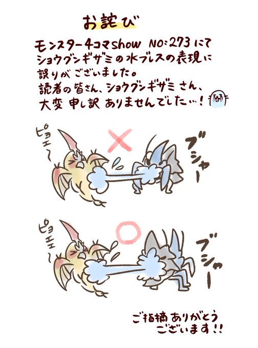 【お詫び】こちらの4コマ漫画につきまして、ショウグンギザミさんのブレスをお口から噴射させてしまうという凡ミスをしてしまいました…!本当にごめんなさい!ご指摘頂き「た、たしカニ…!」となりました😭気をつけます…! twitter.com/capcom_mhb/sta…