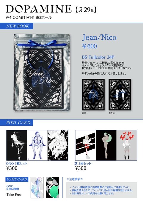 7 18 9月コミティア新刊合同イラスト本表紙!🙌 B5サイズ/フルカラー24P/「呼吸」をテーマにした合同イラスト本「Jean/Nico」 デザインは芝さん(@shibahu16)#COMITIA141 22/08/17 23:51