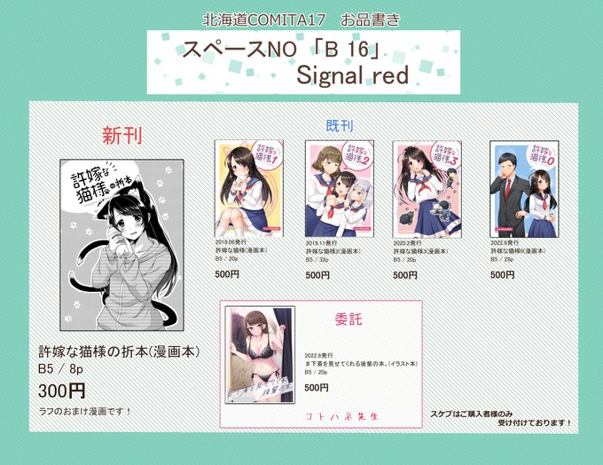 改めましてC100にスペースを頂けておりました!新刊出せるよう頑張りますのでよろしくお願い致します! あなたのサークル「Signal red」は、コミックマーケット100で「土曜日東地区 "J " 41b」に配置されました!webcatalog.circle.ms/Perma/Circle/1… #C100WebCatalog