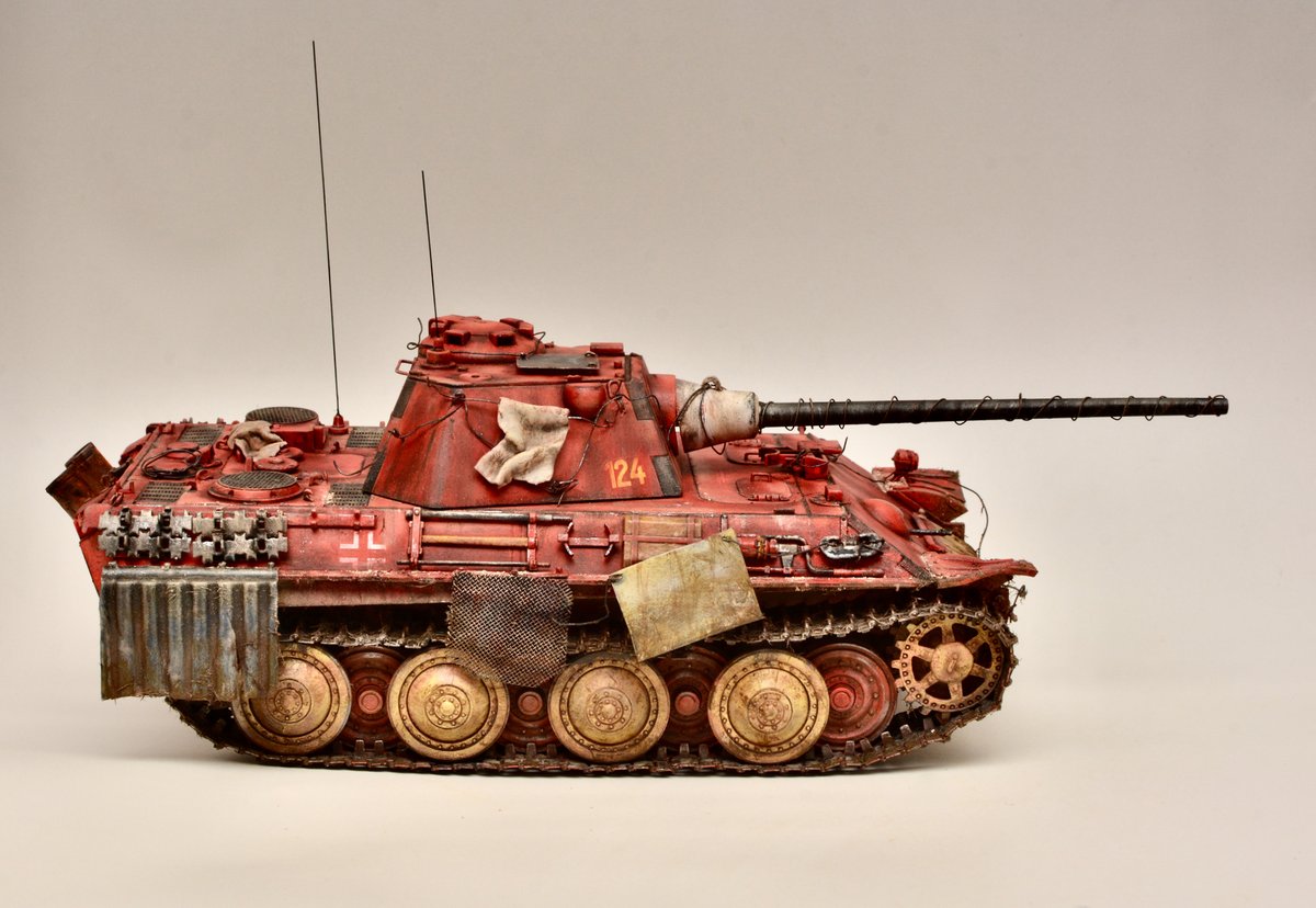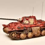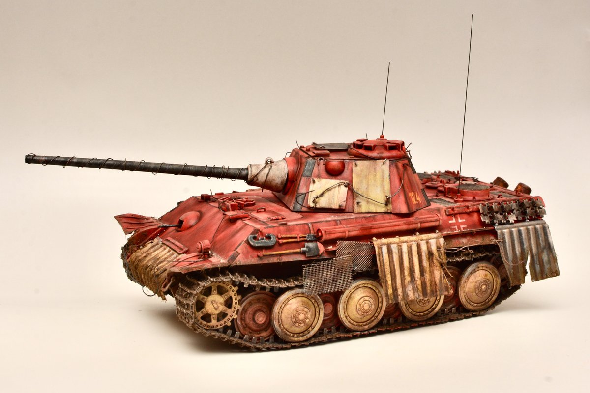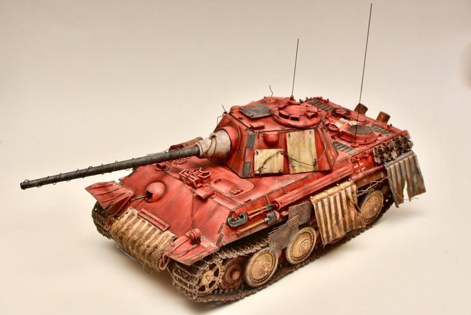 Panther Ausf.F (1/35, Dragon) 完成です!趣味全開のIFで真っ赤に塗りましたよ。スプレーでテカテカに赤く塗って、油彩具で地道に仕上げました。謎の装甲は豆腐パックの側面でした。#筆塗り #Scalemodel #模型戦車道