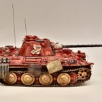 74 298 Panther Ausf.F (1/35, Dragon) 完成です!趣味全開のIFで真っ赤に塗りましたよ。スプレーでテカテカに赤く塗って、油彩具で地道に仕上げました。謎の装甲は豆腐パックの側面でした。#筆塗り #Scalemodel #模型戦車道 22/01/09 00:09