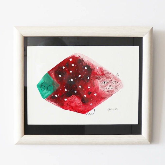 「ストロベリーキャット」 2023 アクリルガッシュ、化粧土など 現物は、是非6cさんで観ていただきたい😊 #illustration #illustrator #イラスト #版画 #オオヤマネコ #アナログ画 #絵 #イラスト #オリジナルイラスト #創作