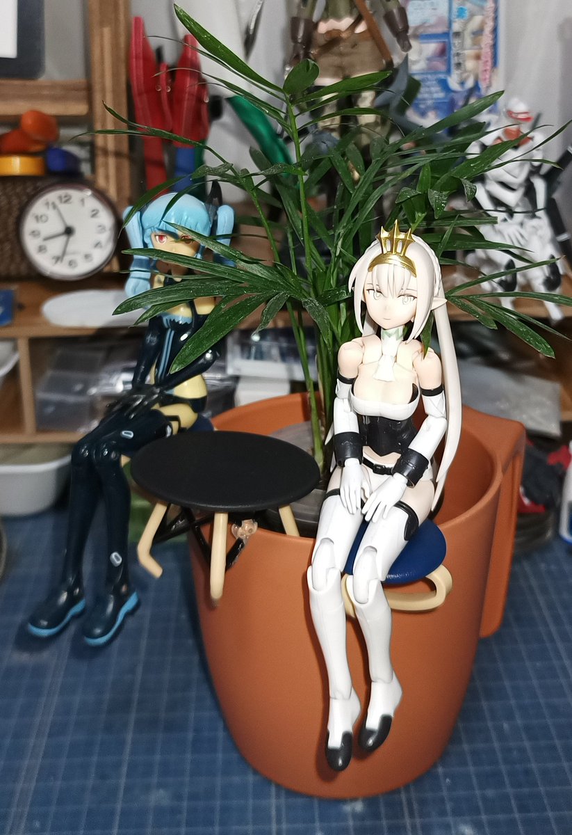 こう水耕栽培の鉢植えがあるじゃろ? で、縁にテーブルと丸椅子の脚を曲げてつけるじゃろ そうすると観賞植物を観賞してるみたいになるんじゃ お休みなさいまし #メガミデバイス #武装神姫