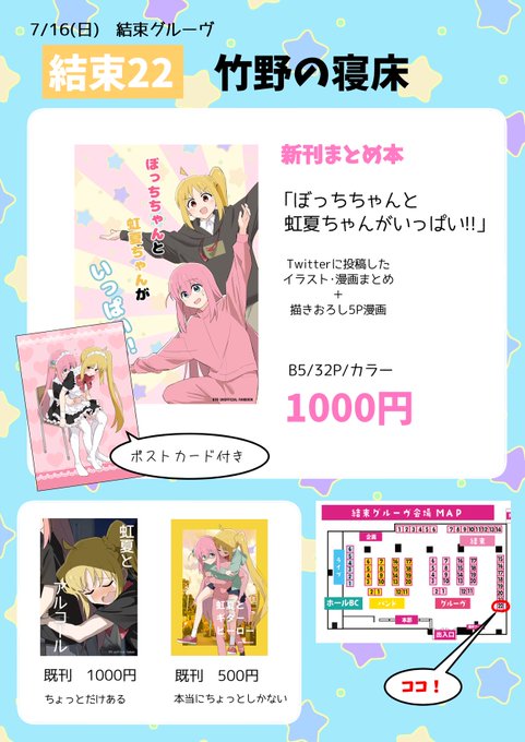 291 1516 7/16(日)結束グルーヴの新刊です B5/32P(表紙含む)/1000円 描き下ろしは5p漫画です あとキラキラしたポストカードが付いてくる予定です 23/07/10 20:16