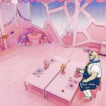 ブルーベリー学園で部室カスタム出来るってやつの例にめちゃくちゃピンクでファンシーな部屋があって、あの部屋に特別講師のアオキさん呼んだら絵面面白すぎるけどハイダイさんはかわいい部屋に居ても違和感なくない?と言う話しになったので思わず描いた