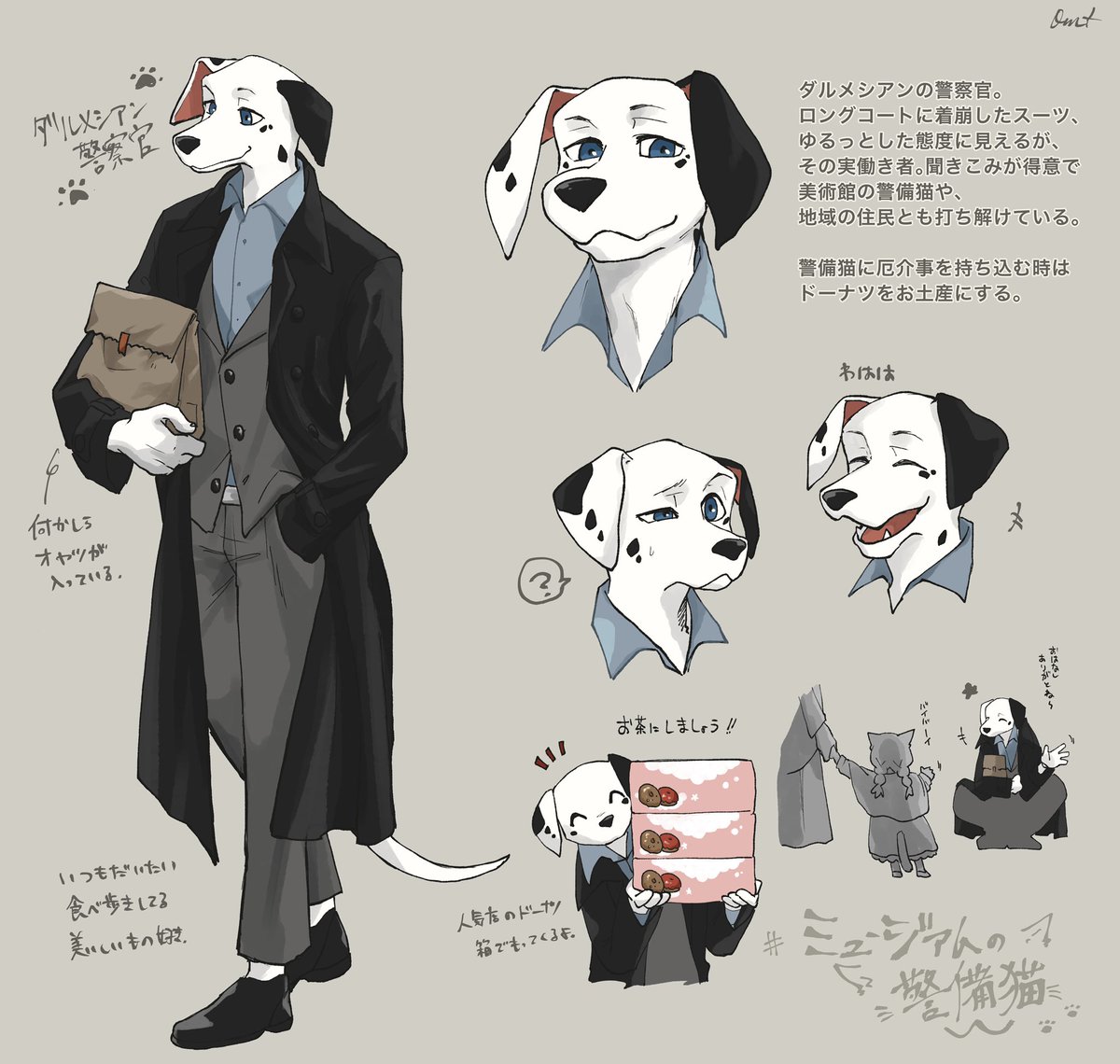 きっと何気ない聞き込みで得た証言で事件が解決する回とかあるんだろうな〜!厄介ごとの大きさに比例してドーナッツの箱が増えます。人間寄りも描いてみたい。 #ミュージアムの警備猫 twitter.com/bengara0/statu…