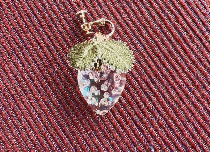 0 6 クリアな苺が可愛かったから試作品作ってみたけど大人でもつけられそうなデザインで可愛い☺️♡ もう片方は息子に取られてしまった🍓 #立体刺繍 23/03/23 08:56