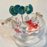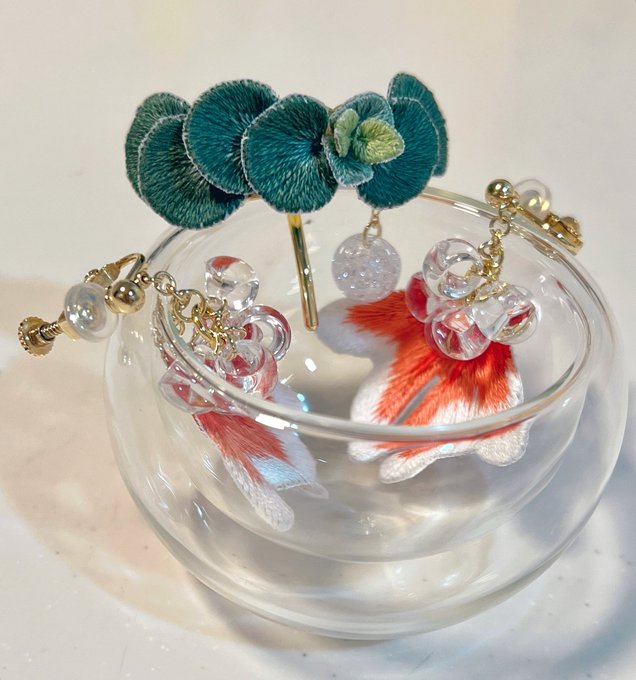 0 5 水草のポニーフックと金魚のイヤリングセット、白鳥の停車場さんに納品予定です🤗 #立体刺繍 23/06/01 20:20