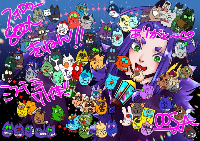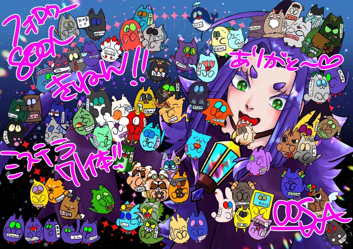 800人記念イラスト完成しました!ご参加して下さった皆さん改めて有難うございます! 完成したイラストはクソでかサイズだったので、DiscordにURLが貼ってあるのでそちらから文字なしがDL可能です💜 サブギフスクチアコメントハイプ感謝! #OOSAWALIVE #さわの使い魔