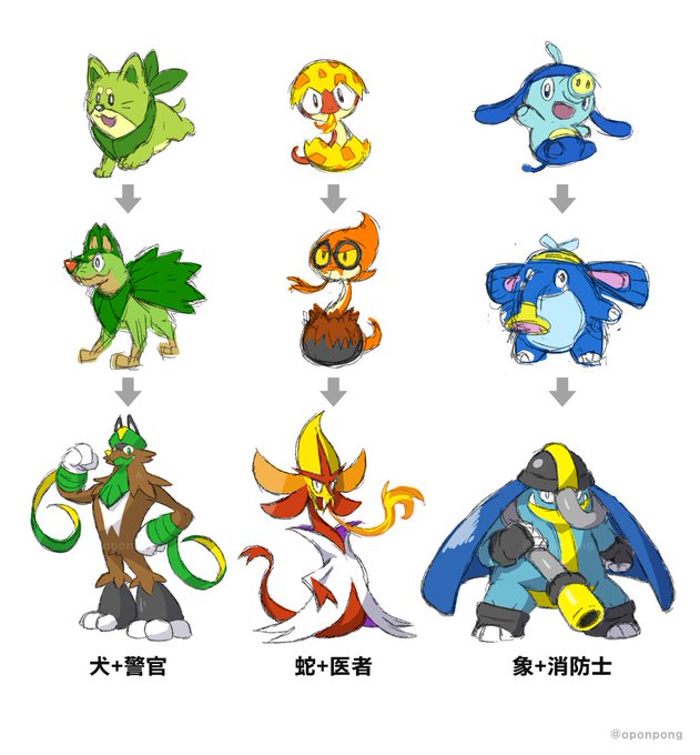 オリポケ御三家の進化ラフ 草は犬のおまわりさん 炎は蛇のお医者さん(杖に巻き付いた蛇は医療のシンボル) 水は象の消防士 モチーフの職業は「小学生が就きたい職業ランキング」の上位から選定してます。警官、医者、消防士はどこの国にもある職業だしね。 #オリポケ #fakemon