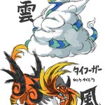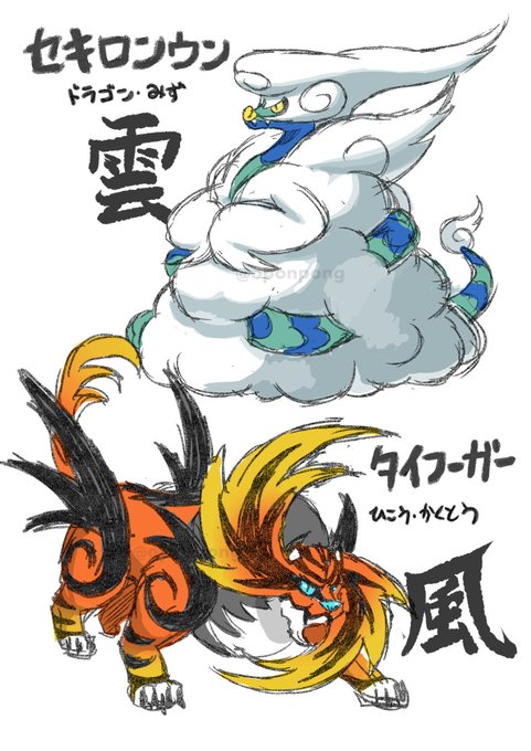 オリポケ2大伝説枠考えてみたよ。 雲を纏いし竜セキロンウンと、風を纏いし虎タイフーガー。 龍虎モチーフです。 #fakemon #pokemon #オリポケ
