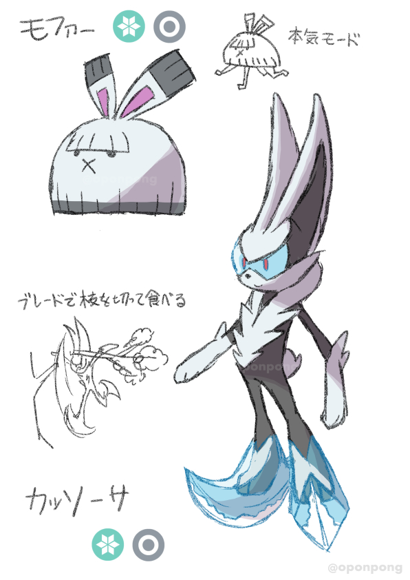 69 459 モファー:ゆきうさぎポケモン(氷・ノーマル) カッソーサ:ゆきうさぎポケモン(氷・ノーマル) ユキウサギと氷上競技がモチーフです。 #オリポケ #fakemon 22/09/30 00:23