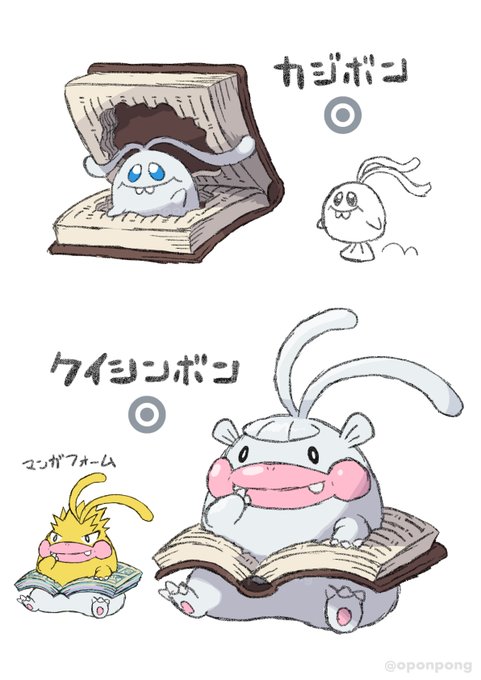 カジボン:かみぐいポケモン(ノーマル) クイシンボン:かみぐいポケモン(ノーマル) 紙魚(Silverfish)がモチーフのポケモン。 食べた本が漫画雑誌だとマンガフォームになります。 #fakemon #オリポケ