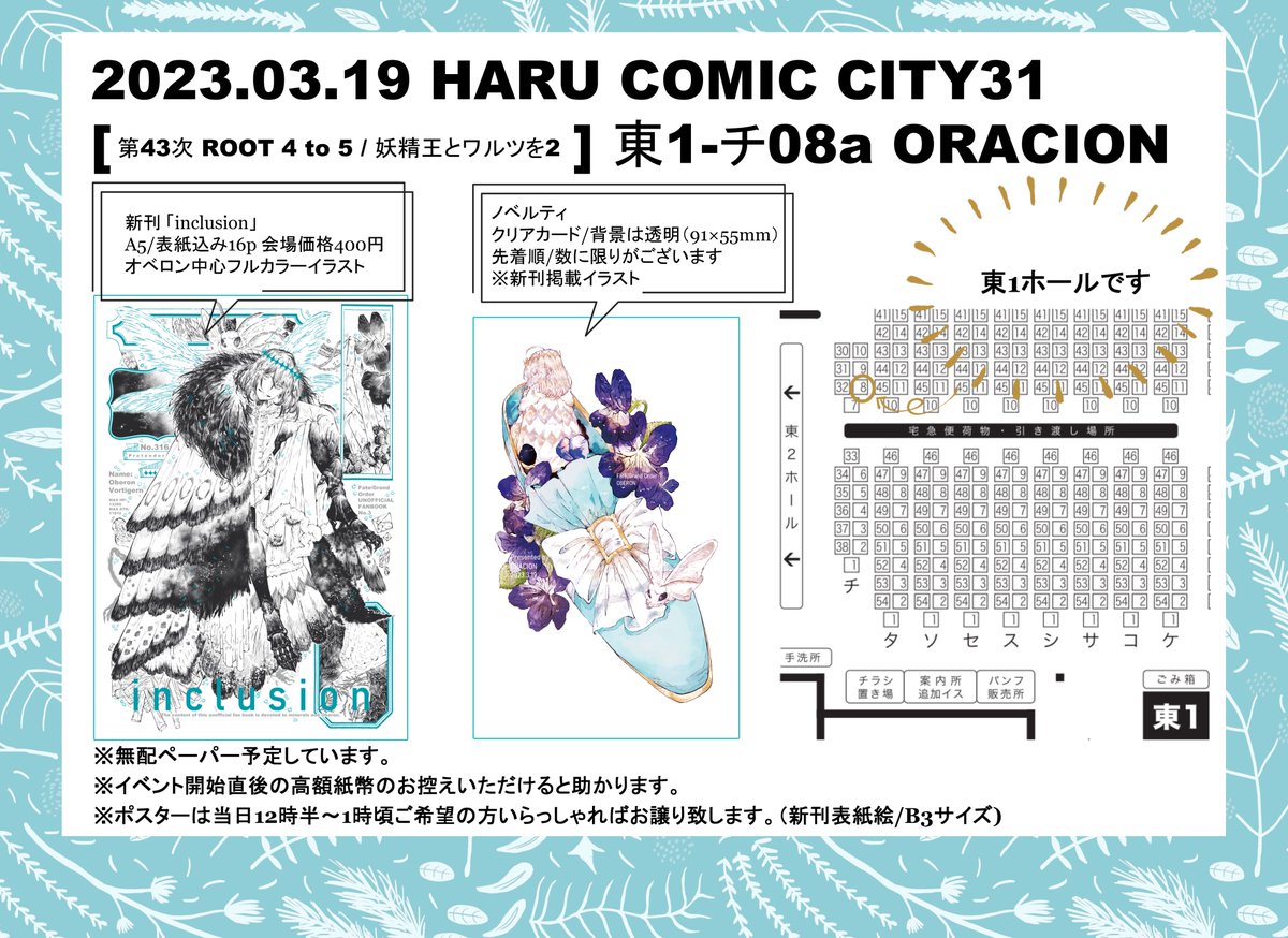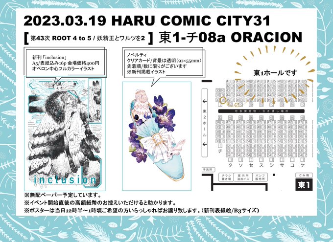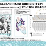 【春コミ3/19 おしながき】 東1-チ08a「ORACION」 当日は数に限りがありますが、ノベルティがあります。無配ペーパー持っていく予定。宜しくお願い致します🙇♀️ 📝新刊サンプル pixiv.net/artworks/10621… 🐯通販 ecs.toranoana.jp/joshi/ec/item/…