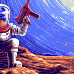 'Cosmonaut' for #pf_twoweek 16x16=4 colours 32x32=8 colours 64x64=15 colours (I am done cleaning this mess of clusters) Non-compressed: i.imgur.com/VOp8djF.png #pixelart #ドット絵